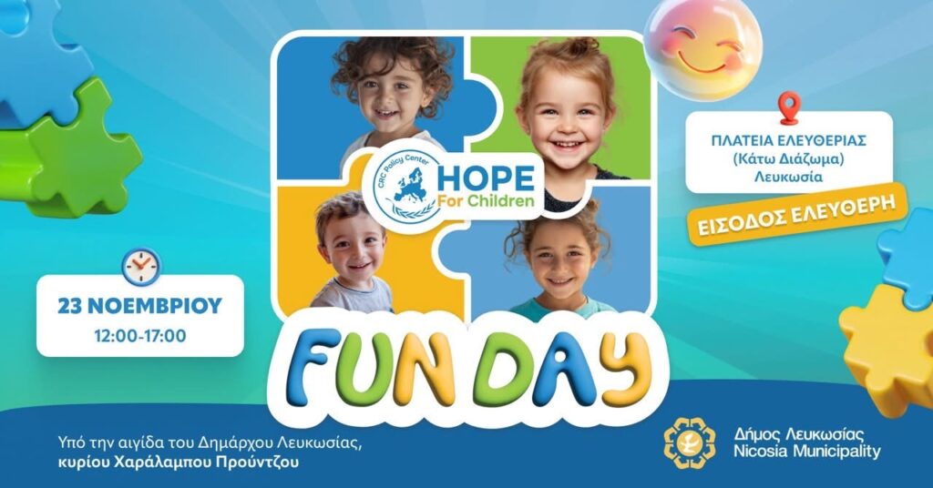 Το Πανηγύρι Χαράς για τα Παιδιά, που διοργανώνει το Hope For Children CRC Policy Center, υπό την αιγίδα του Δημάρχου Λευκωσίας, κ. Χαράλαμπου Προύντζου, θα πραγματοποιηθεί την Κυριακή 23 Νοεμβρίου από τις 12:00 μέχρι τις 17:00 στο Κάτω Διάζωμα της Πλατείας Ελευθερίας στη Λευκωσία με ελεύθερη είσοδο για όλους.