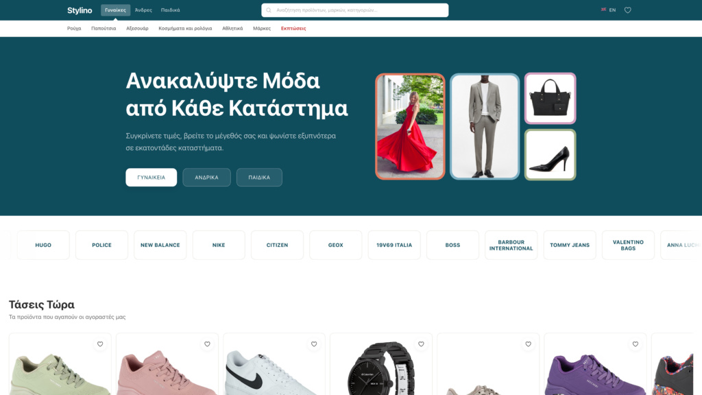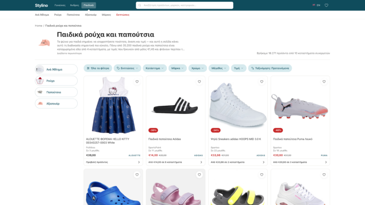 Ένα ζευγάρι παιδικά αθλητικά μπορεί να κοστίζει 25€ σε ένα κατάστημα και 38€ σε ένα άλλο. Ένα χειμωνιάτικο μπουφάν μπορεί να βρεθεί με έκπτωση 40% — αρκεί να ξέρεις πού να κοιτάξεις. Το Stylino κάνει αυτή τη σύγκριση αυτόματα, σε πάνω από 385.000 προϊόντα από 3.350+ brands, ώστε οι γονείς να μη χρειάζεται να ανοίξουν δεκάδες tabs στο browser.