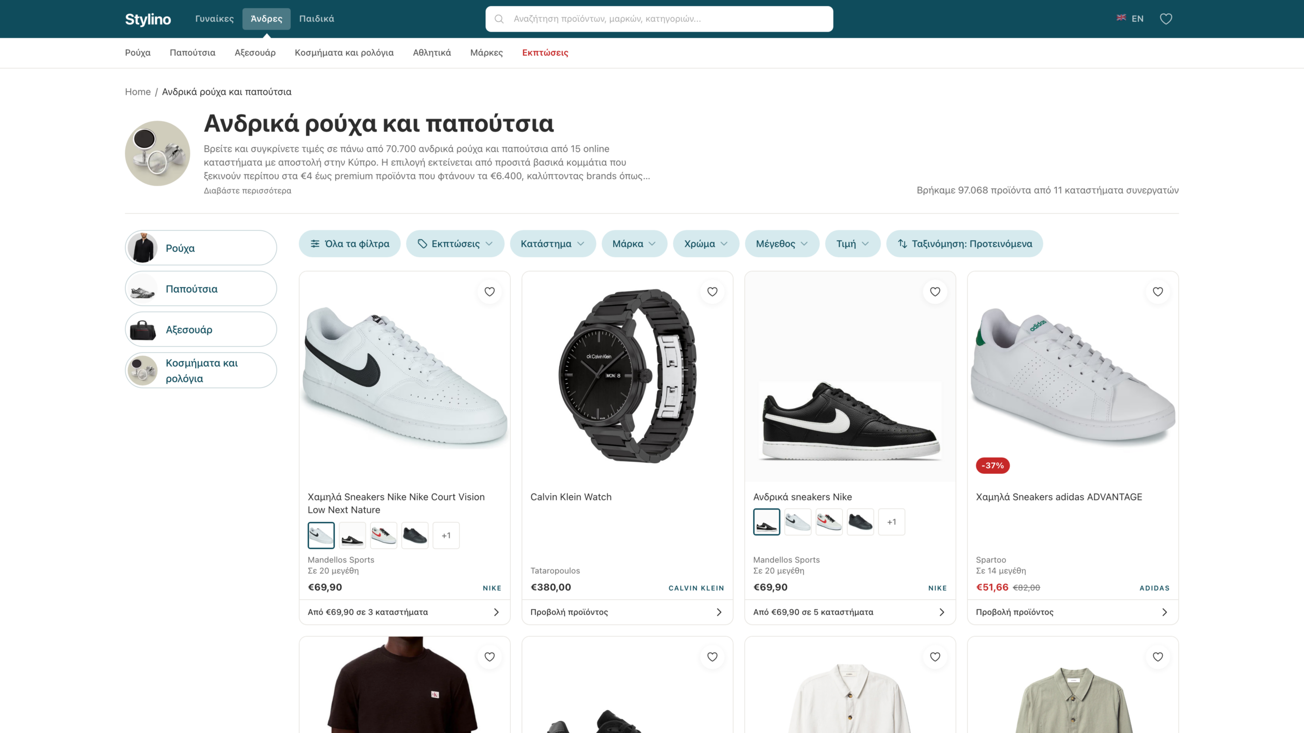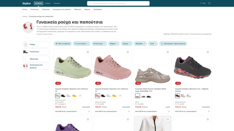 Ο γονιός μπαίνει στο stylino.cy, αναζητά π.χ. «παιδικά sneakers» ή «βρεφικά ρούχα», και βλέπει αμέσως αποτελέσματα από δεκάδες καταστήματα — Spartoo, Tsoukalas, E-tennis, Funky Buddha και πολλά ακόμα — ταξινομημένα κατά τιμή. Μπορεί να φιλτράρει κατά μέγεθος, χρώμα ή τιμή. Με ένα κλικ μεταφέρεται στο κατάστημα με την καλύτερη τιμή για να ολοκληρώσει την αγορά.